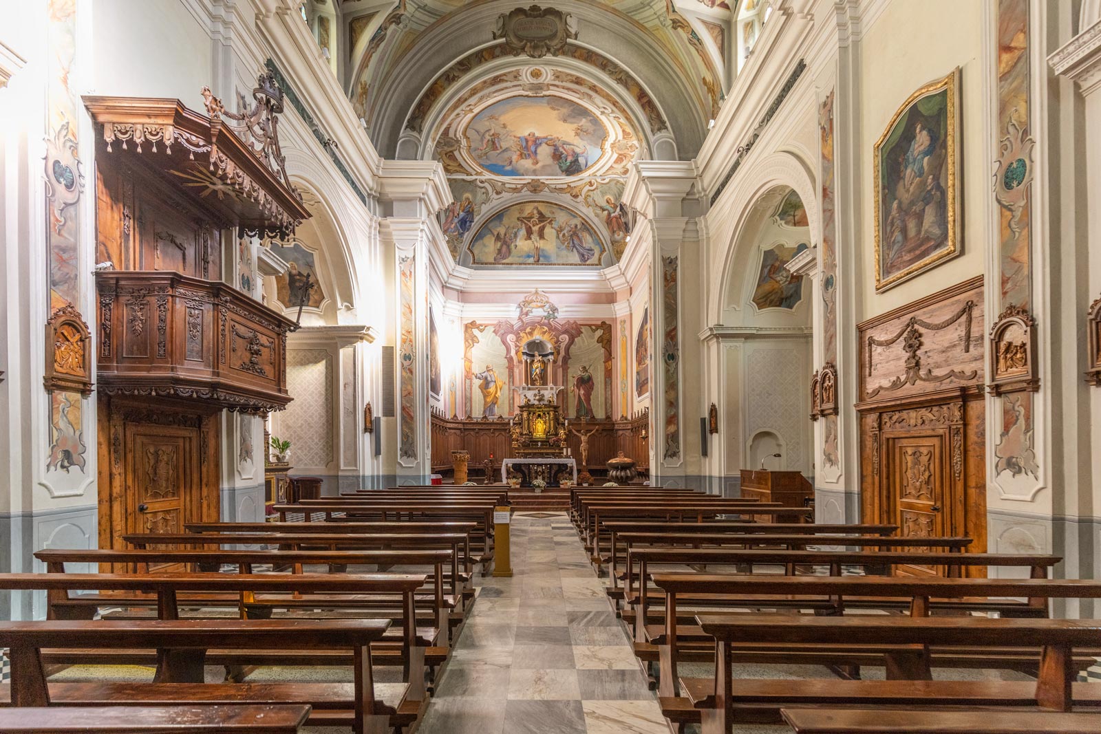 Le ancone e cornici settecentesche in legno dorato sono particolarmente notevoli. La pala d’altare dell’Assunta con i santi G. Battista e Antonio Abate del 1698 e quella del 1700 della Sacra Famiglia sono attribuite a G. Battista Muttoni.