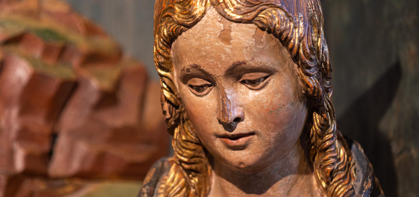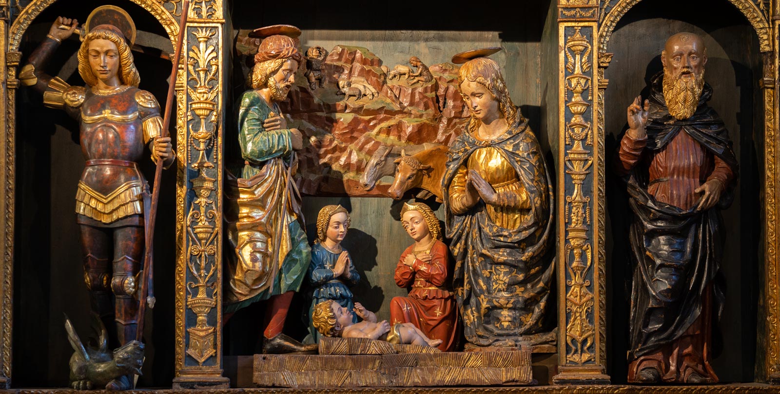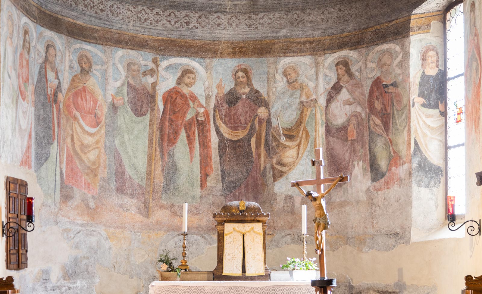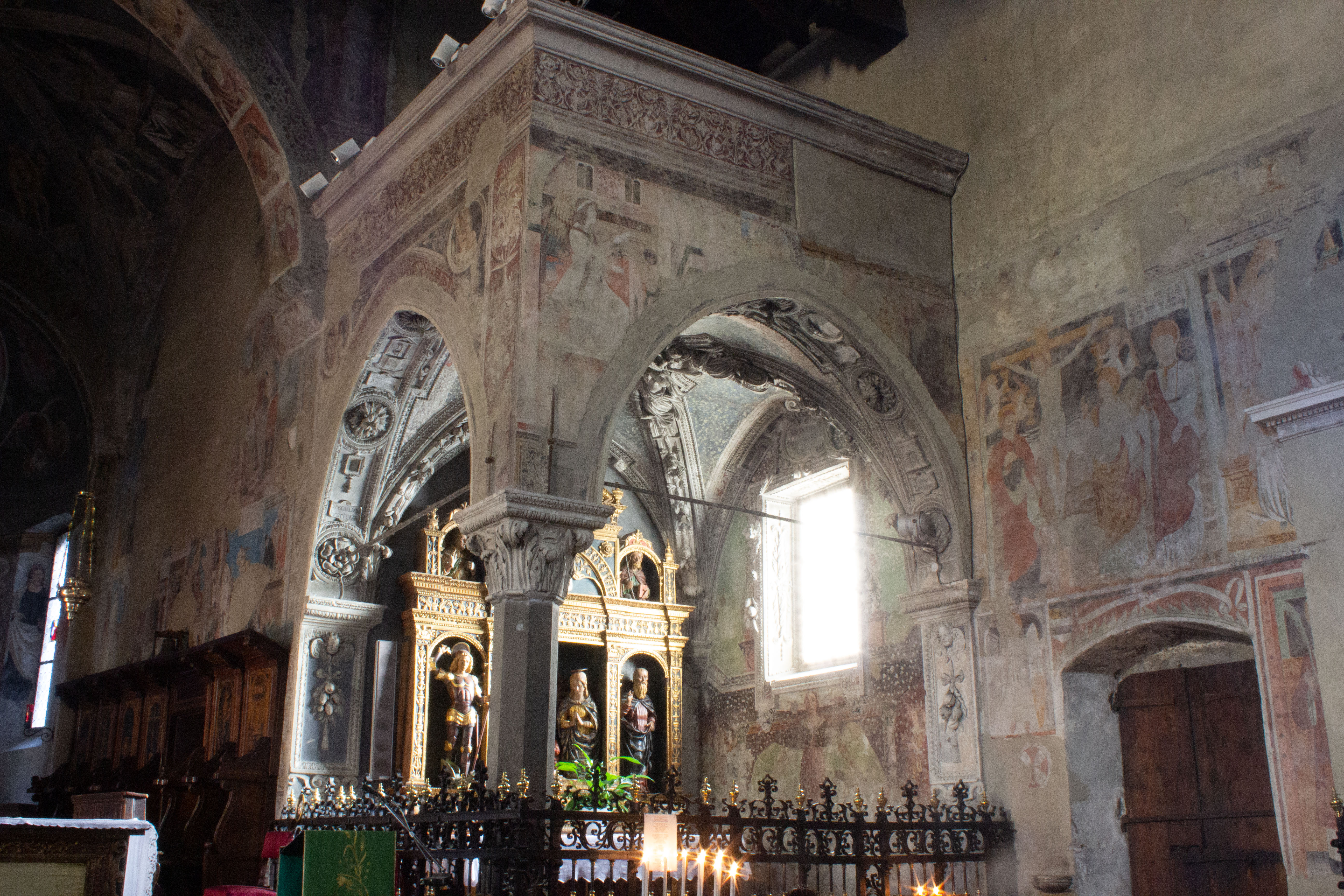 Di particolare pregio è l’ancona lignea della cappella della Beata Vergine (1494). Ormai pienamente rinascimentale, l’opera è frutto della collaborazione dell’intagliatore Pietro Bussolo e del pittore Andrea De Passeris. Nel trittico sono raffigurati i busti di Cristo e dei dodici Apostoli, la Natività con le statue dei Santi Giorgio e Antonio Abate e, nell’ordine soprastante, il Cristo sofferente tra i Santi Gregorio Magno e Giacomo, coronati dal timpano triangolare con l’Eterno Padre.
