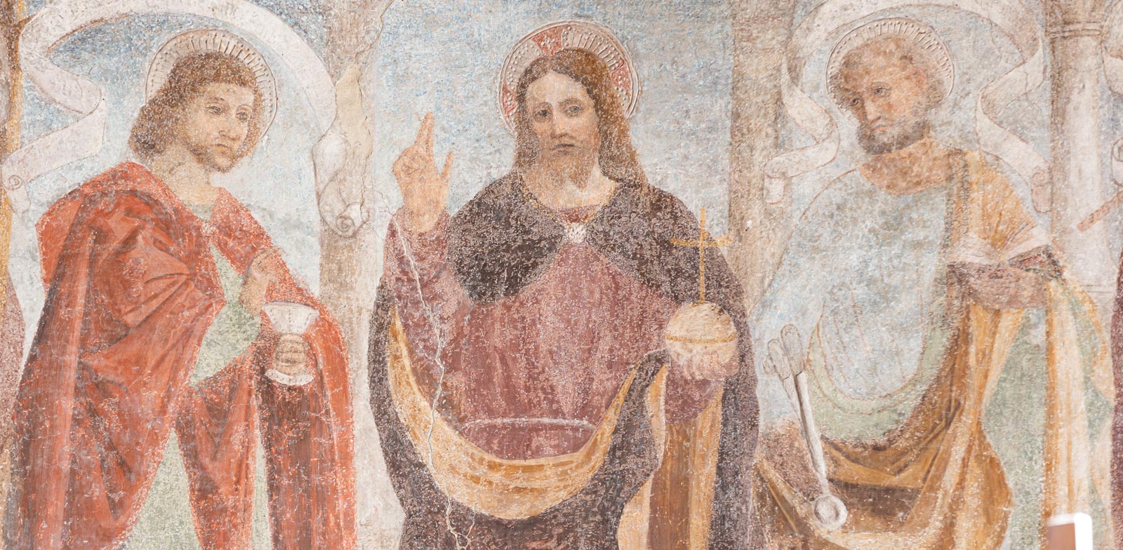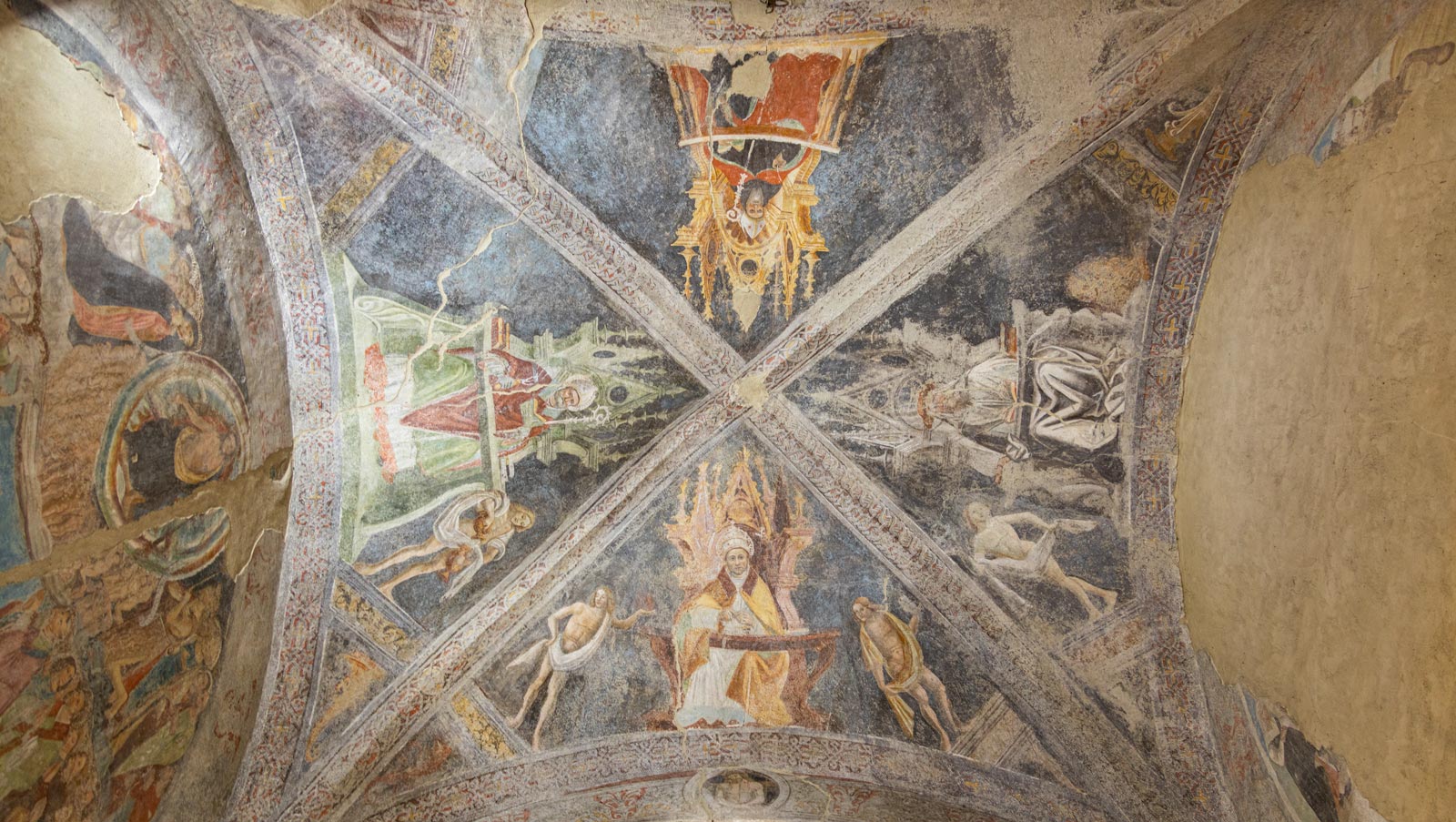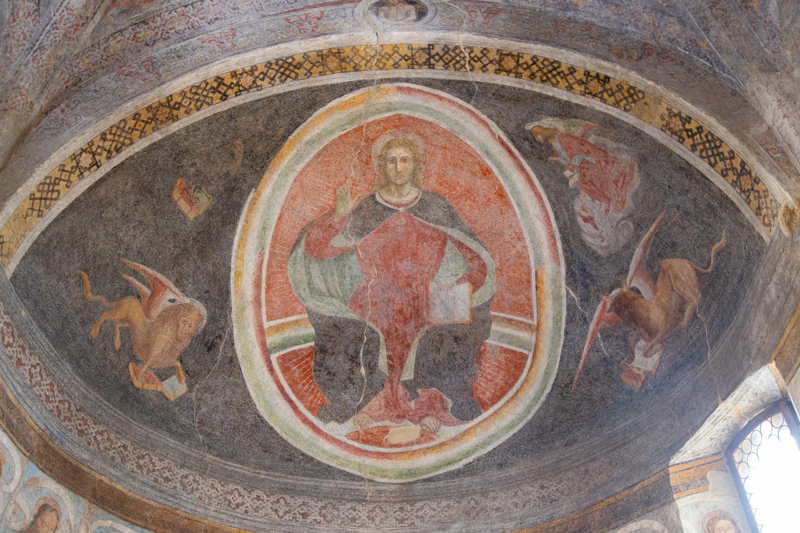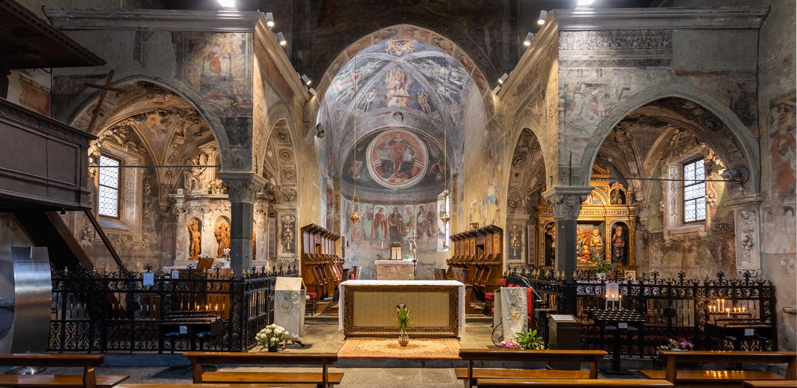 L’apparato decorativo si distingue per il ciclo di affreschi di Andrea De Passeris nel presbiterio, dedicato alla Vita di S. Giorgio e sovrastato dal Cristo Pantocratore, e per quello elegante e composto dell’ignoto pittore bramantesco nella cappella della Madonna.