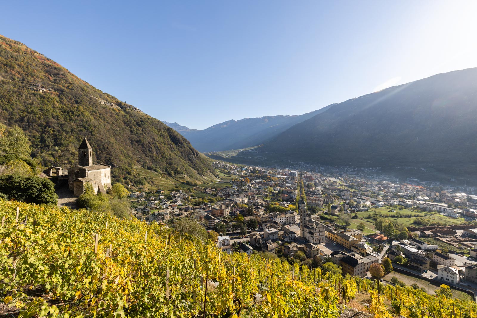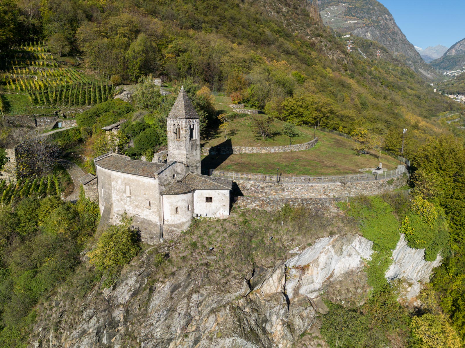 La chiesa di Santa Perpetua si innalza su un ciglio roccioso del pendio montano, all’imbocco della Valle di Poschiavo: una posizione panoramica da cui si gode una vista suggestiva sulla cerchia dei monti, sul rinascimentale Santuario della Madonna e sul centro abitato di Tirano.