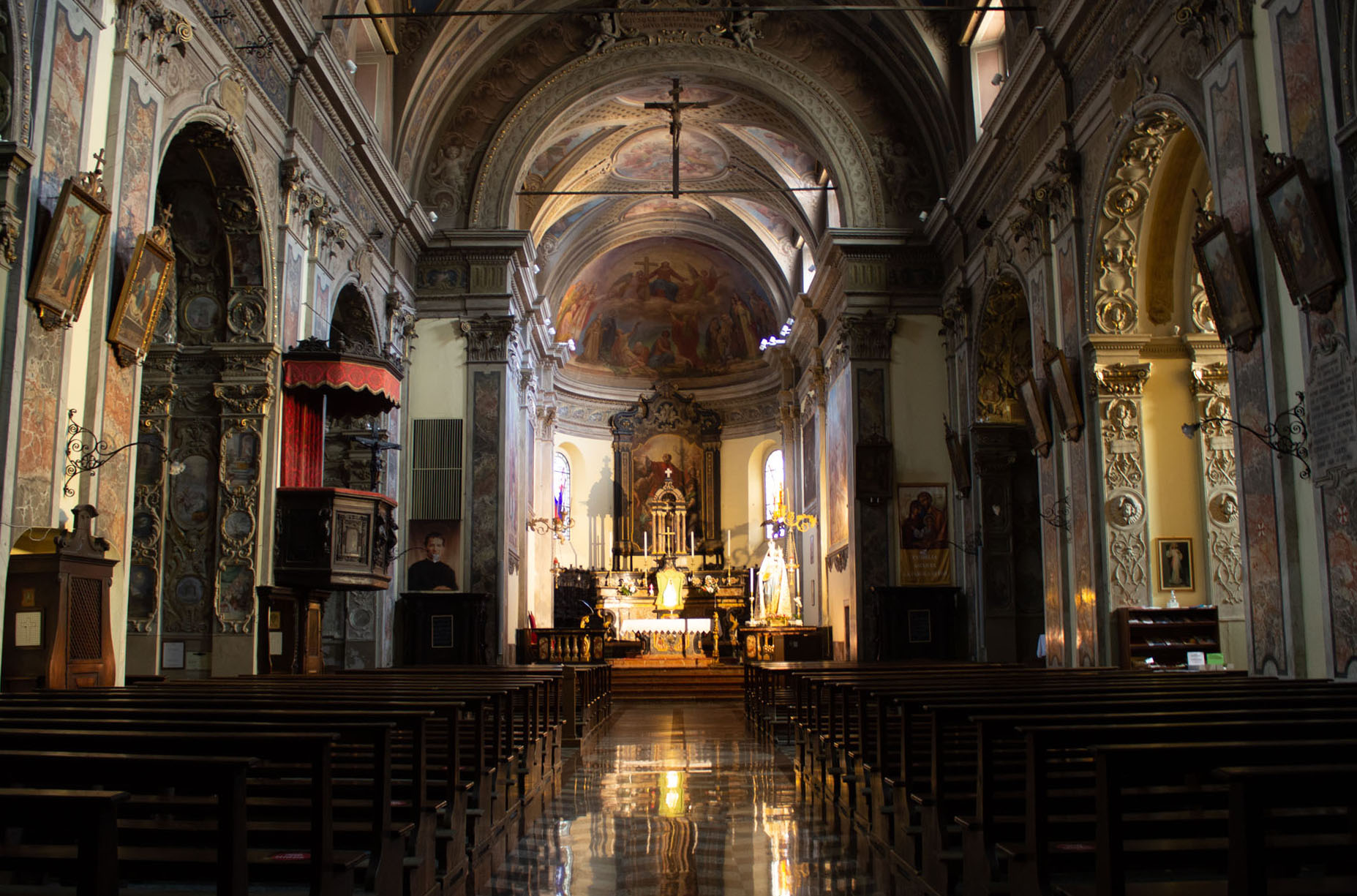 Della chiesa riedificata nel XII secolo in stile romanico oggi resta solo il campanile. L’imponente struttura attuale si caratterizza, infatti, all’esterno per la compresenza di elementi architettonici barocchi e parti neoclassiche, risalenti all’Ottocento. Anche l’originale pianta basilicale romanica, con colonne e tre navate, lasciò il posto, nel 1632, alla sala unica, d’impianto barocco. L’edifico fu poi ulteriormente ampliato nel 1874 su progetto dell’architetto Carlo Maciacchini. Sulle volte della navata spiccano gli affreschi di storia sacra di Giovanni Gavazzeni (1904) e le pitture di Luigi Tagliaferri, distribuite in vari punti all’interno della chiesa e risalenti al primo Novecento. Le cappelle laterali sono impreziosite da ancone in stucco dorato, altari in marmo, dipinti ad affresco e su tela e statue lignee. Sulla controfacciata giganteggia la cassa dell’organo con la parte centrale secentesca e i completamenti laterali risalenti al primo Novecento.