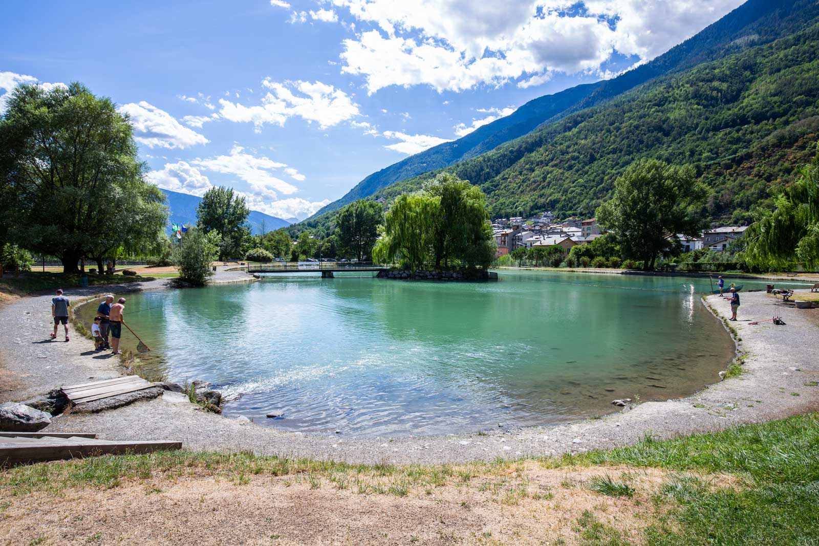 Passeggiando nella campagna intorno al fiume è possibile osservare un esempio virtuoso di addomesticamento delle acque, estremamente interessante dal punto di vista ingegneristico, con vasche di smistamento e canali. I bacini d’acqua, fondamentali per il funzionamento della centrale di Grosotto, importante impianto idroelettrico, creano un paesaggio artificiale caratteristico. Accanto alle strutture di servizio, si riconosce ancora intatto il paesaggio agrario tipico del fondovalle, con i muretti a secco che separano le proprietà, i prati a sfalcio e i campi.